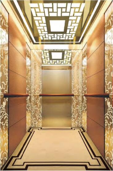 Ceiling: Ti-gold mirror st.st., acrylic light decoration Car wall: Rear wall central panel Ti-gold mirror st.st., two side walls central panel leather, three sides car wall auxiliary panel Ti-gold mirror etched st.st., Ti-gold hairline st.st. closure line on the top of three sides, front wall Ti-gold mirror st.st. Handrail: Ti-gold handrail, leather Floor: Marble